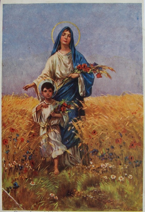 Krakowski artysta przełomu wieków – Adam Setkowicz podejmował w swoich dziełach malarskie motywy, które umieszczał na tle rodzinnych krajobrazów polskiej wsi, lasów i łąk. W taki też sposób przedstawił sielski wizerunek Matki Boskiej Zielnej, która spaceruje ze swoim Synem wśród łanów dojrzałego sierpniowego zboża pełnego kłosów i polnych kwiatów. Nad nimi letnie lazurowe niebo.